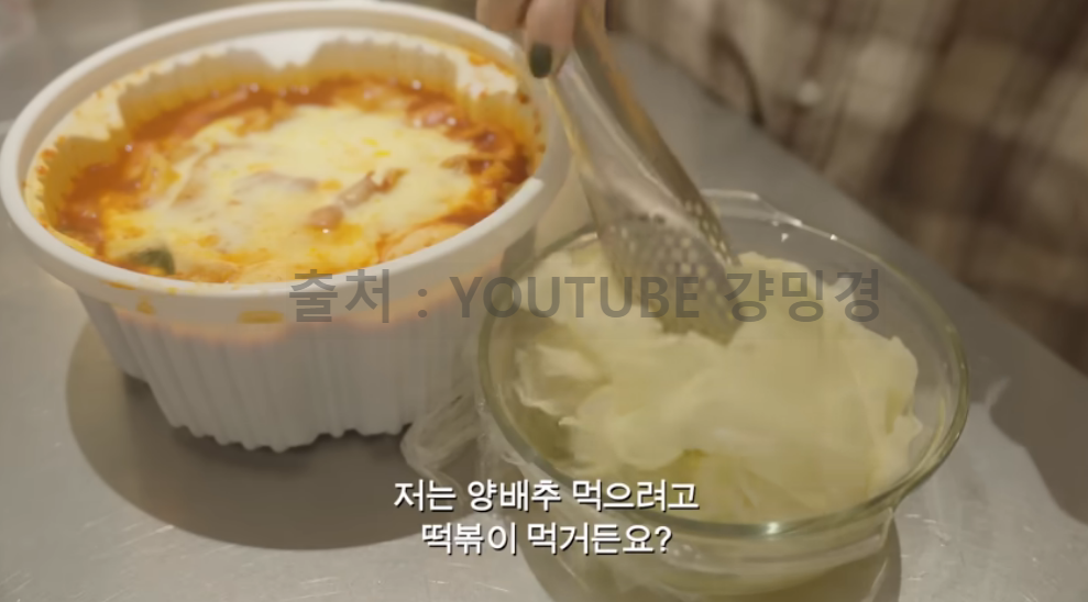 가수 강민경(다비치)이 유튜브에서 엽기떡볶이를 먹으면서 쪄낸 양배추를 곁들여 먹는 모습이 화제가 되었습니다.